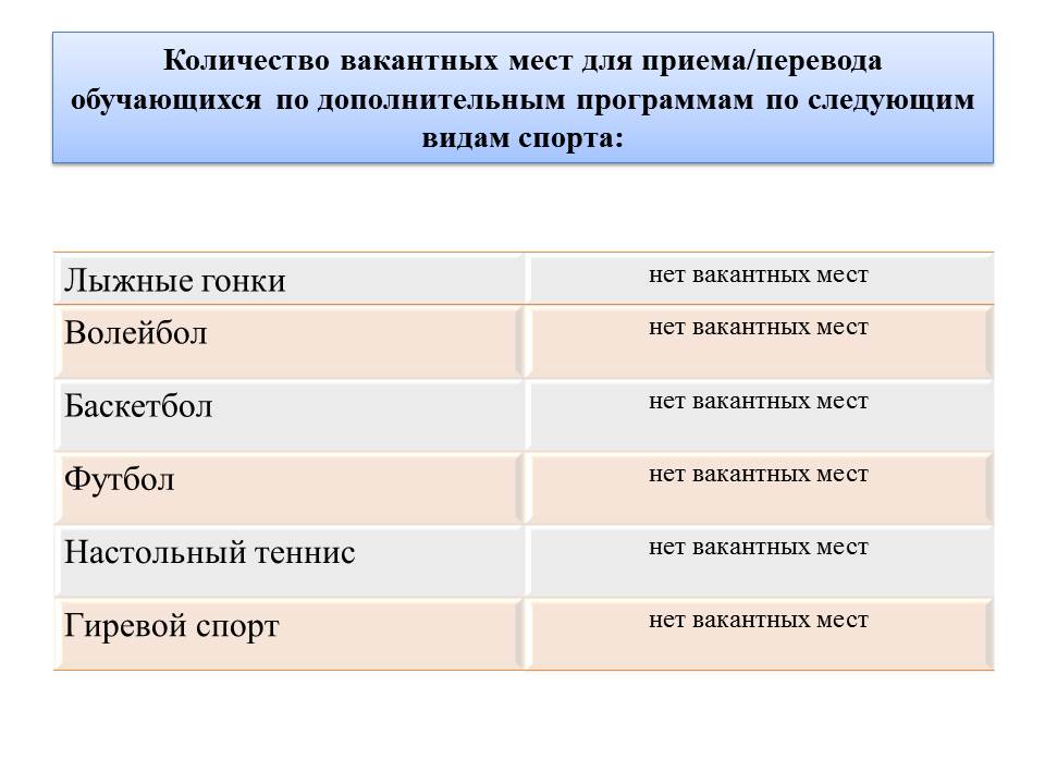 Вакантные места для приёма (перевода) Всего в организации за счет бюджета ассигнований местного бюджета обучается 217 человек. Обновление информации о наличии вакантных мест ведется перед началом каждого нового учебного года. Заявление для родителей для зачисления ребенка в МУДО «Сретенская ДЮСШ»Скачать